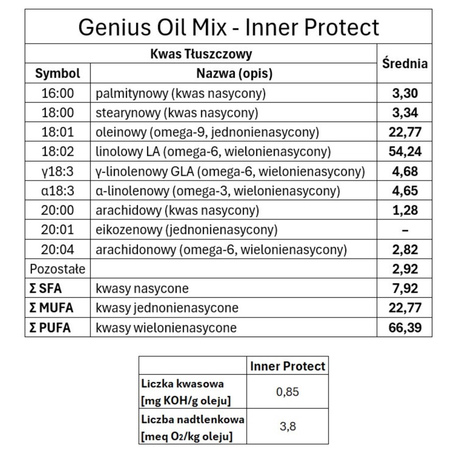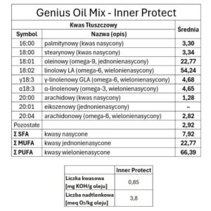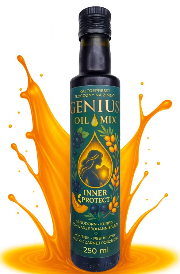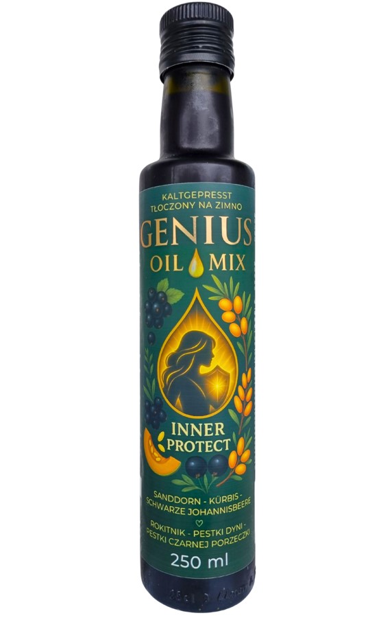 Genius Oil Mix – Inner Protect to w pełni naturalna mieszanka olejów roślinnych, tłoczonych na zimno i nierafinowanych. Dzięki temu zachowuje maksymalną ilość substancji aktywnych, witamin i niezbędnych kwasów tłuszczowych. Aby w pełni wykorzystać jej właściwości, ważne jest odpowiednie stosowanie i przechowywanie.