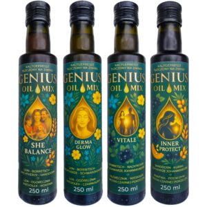 Genius Oil Mix – Vitale to starannie skomponowana mieszanka trzech zimnotłoczonych olejów roślinnych, których wspólnym mianownikiem jest wyjątkowo wysoka zawartość kwasu GLA – substancji kluczowej dla zdrowia, równowagi hormonalnej, kondycji skóry oraz funkcji immunologicznych.