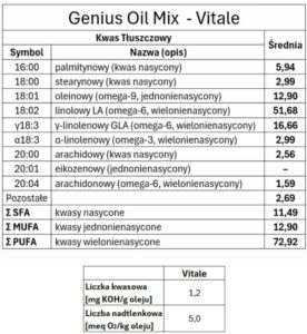 Każda partia Genius Oil Mix – VITALE jest analizowana laboratoryjnie pod kątem jakości tłuszczów, świeżości oraz stabilności oksydacyjnej. Wyniki potwierdzają, że to mieszanka czystych, aktywnych biologicznie olejów najwyższej klasy.